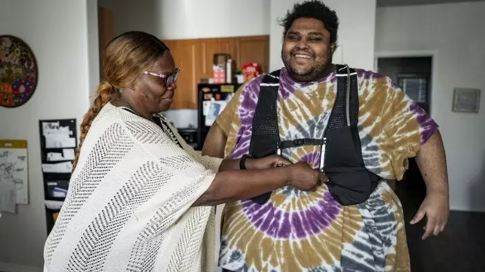 Young Bowens testing the fit of a hydration pack on her son, Jeremiah, who helps maintain Conscious Gear’s social media presence. Photo credit: Eli Hiller