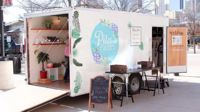 La tienda móvil de Pita es un pequeño remolque repleto de todo tipo de plantas y macetas, la forma perfecta de transportar sus vibrantes maceteros al Dallas Farmers Market. Además, el remolque les brindaba oportunidades totalmente nuevas y perfectas para un negocio móvil.