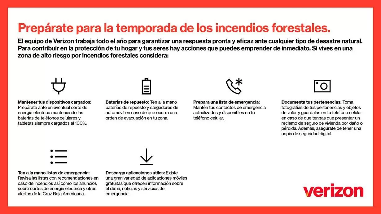 Verizon ofrece consejos de preparación para los consumidores, desde proteger dispositivos personales hasta descargar aplicaciones de seguridad esenciales. También destacamos la importancia de la planificación de la continuidad del negocio, garantizando que las organizaciones puedan mantener sus operaciones durante los incendios forestales. Desde SD-WAN hasta herramientas de seguridad avanzadas, Verizon Business equipa a las empresas con las herramientas necesarias para mantener la productividad en medio de interrupciones.