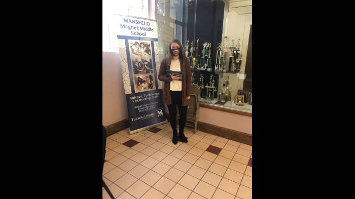 Mansfeld Magnet School coach Trish Croaker shows off her school’s trophy case. (Photo credit: Courtesy of Trish Croaker)