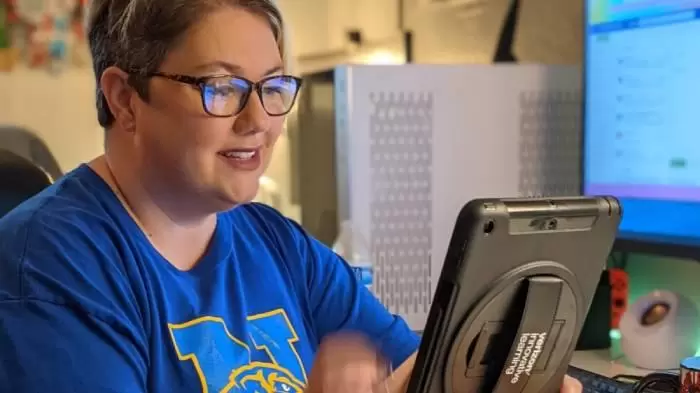Krista Lindquist, a special education teacher at Newburg Middle School, uses her Verizon Innovative Learning-provided device. (Photo credit: Courtesy of Krista Lindquist)