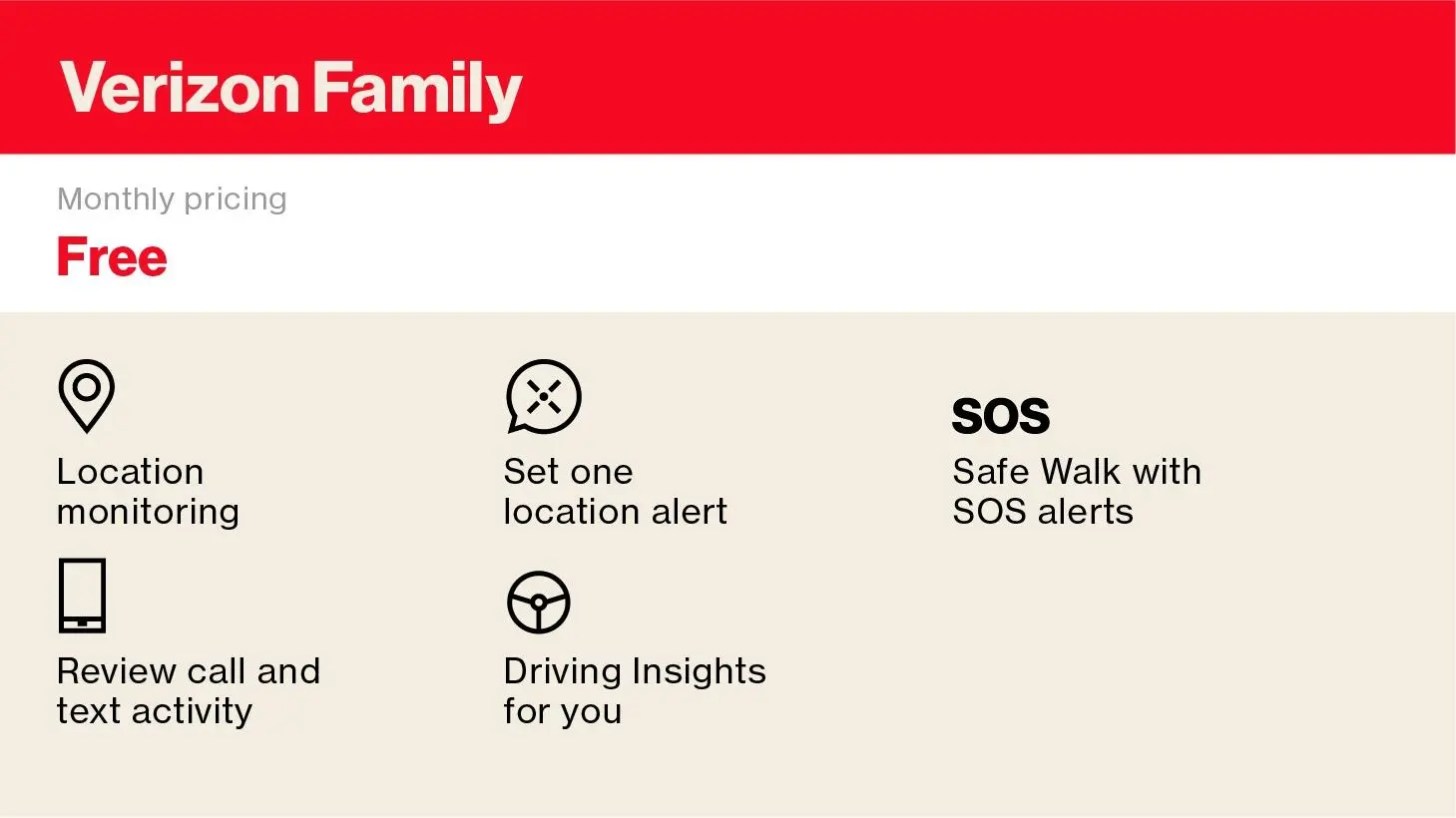 Probably less than your kid’s online gaming habit. The Verizon Family service is free and lets you review Verizon call and text activity, monitor location and see your own driver safety score via the Driving Insights feature. For $14.99 a month, Verizon Family Plus adds premium features —such as enhanced parental controls, roadside assistance and insights about your kid’s driving. And if you’re a Verizon Wireless customer on myPlan (Unlimited Ultimate, Unlimited Plus, Unlimited Welcome or Welcome Unlimited) you can get all the benefits of Verizon Family Plus for just $10 a month through the Verizon Family Plus Perk.