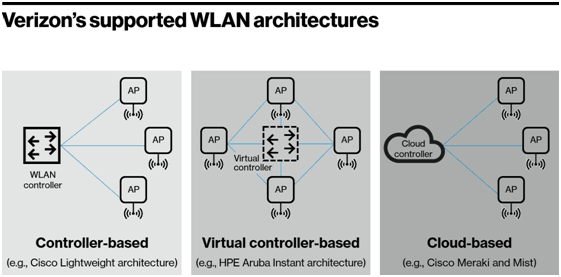 - Implement the necessary WLAN controllers, either on premise or in the Verizon data center. Note: only applicable to controller-based architecture from Cisco or HPE Aruba.Provide visibility to your network for network management (i.e., management PVCs) once the link has been provisioned.